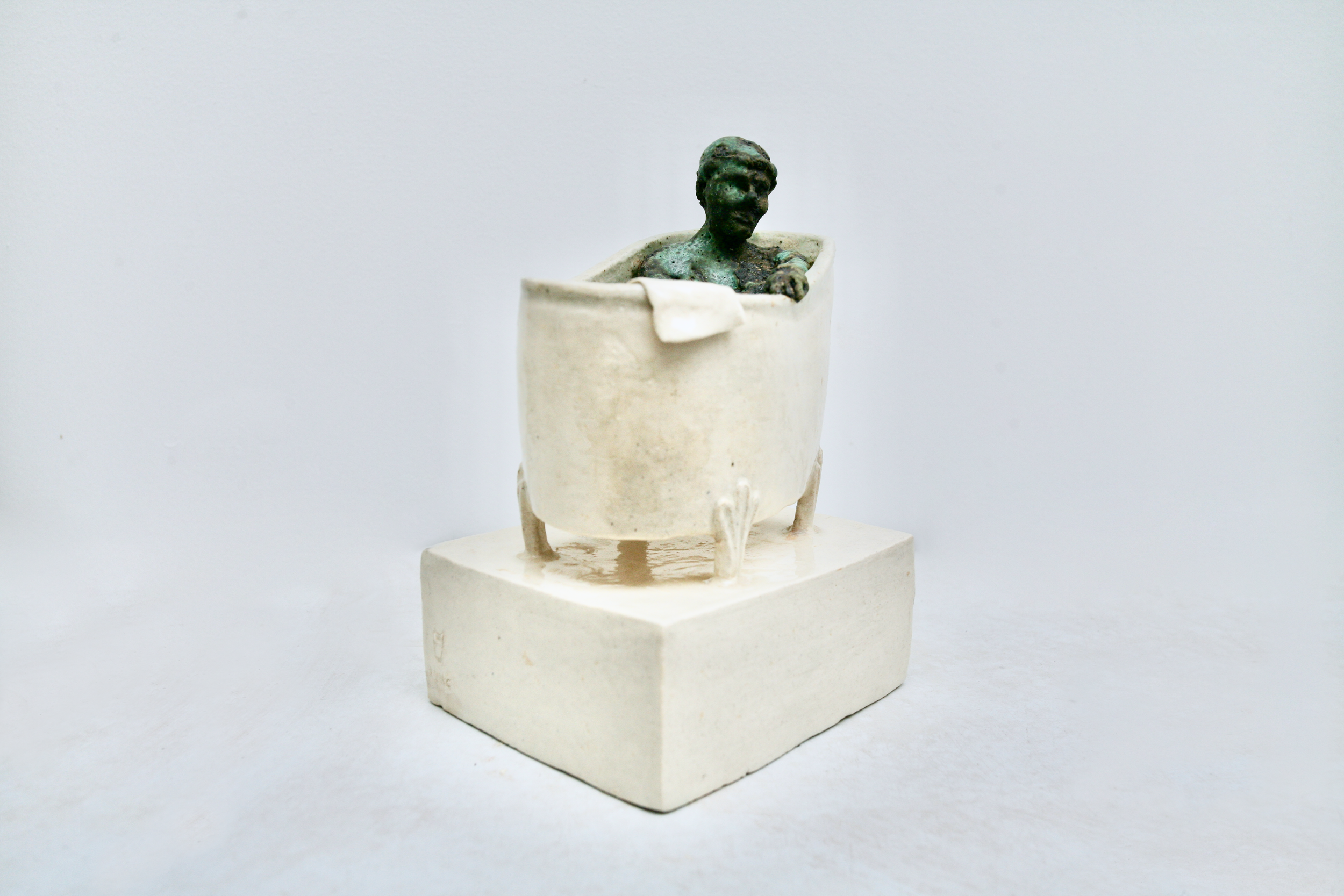 The calmness of being submerged in water has always resonate well with me and i’m sure it resonates with others too. When I was younger I used to sit on the loo seat chatting my mum about our day whilst she bathed, it was unfiltered company that lacked a sense of vulnerability. This sculpture reflects this personal memory of mine; a carefree figure with a shower cap on in deep bath washing themselves with a flannel.