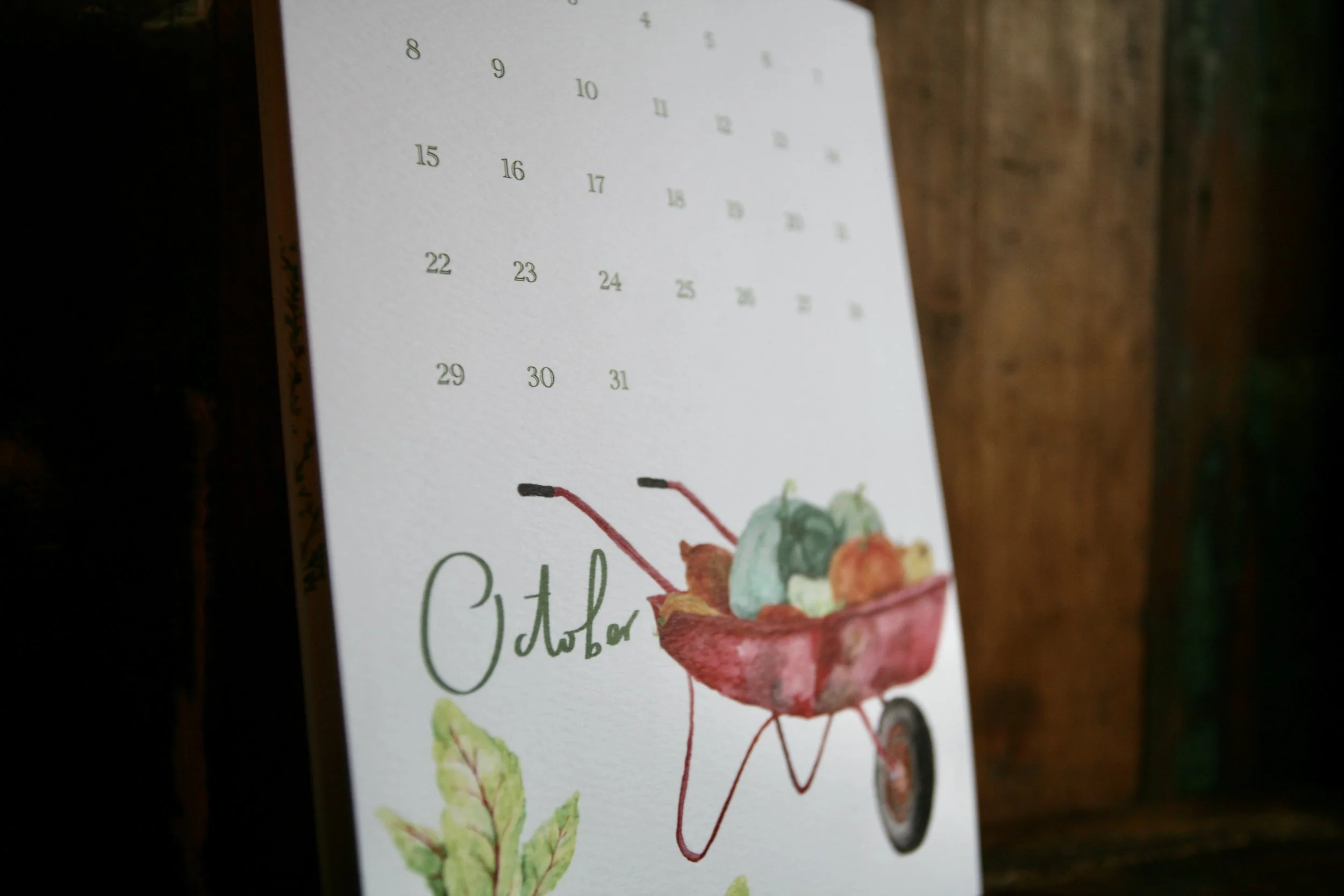 A5 calendar, printed on 250gsm dimpled paper (standard printer paper is 90-120gsm). The illustrations are all watercolour paintings, inspired by the seasonal produce (and the occasional animal) for each month of the year.